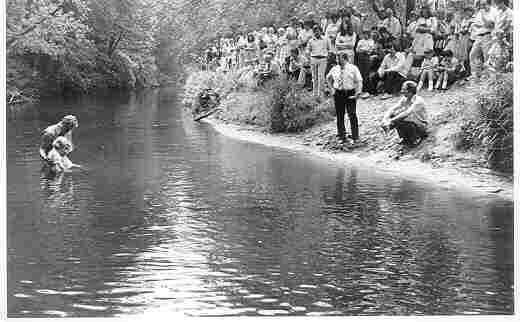 Baptism by immersion in the Nepaug River behind the church, with the congregation watching from shore. Circa 1970. We baptize new believers the same way today.